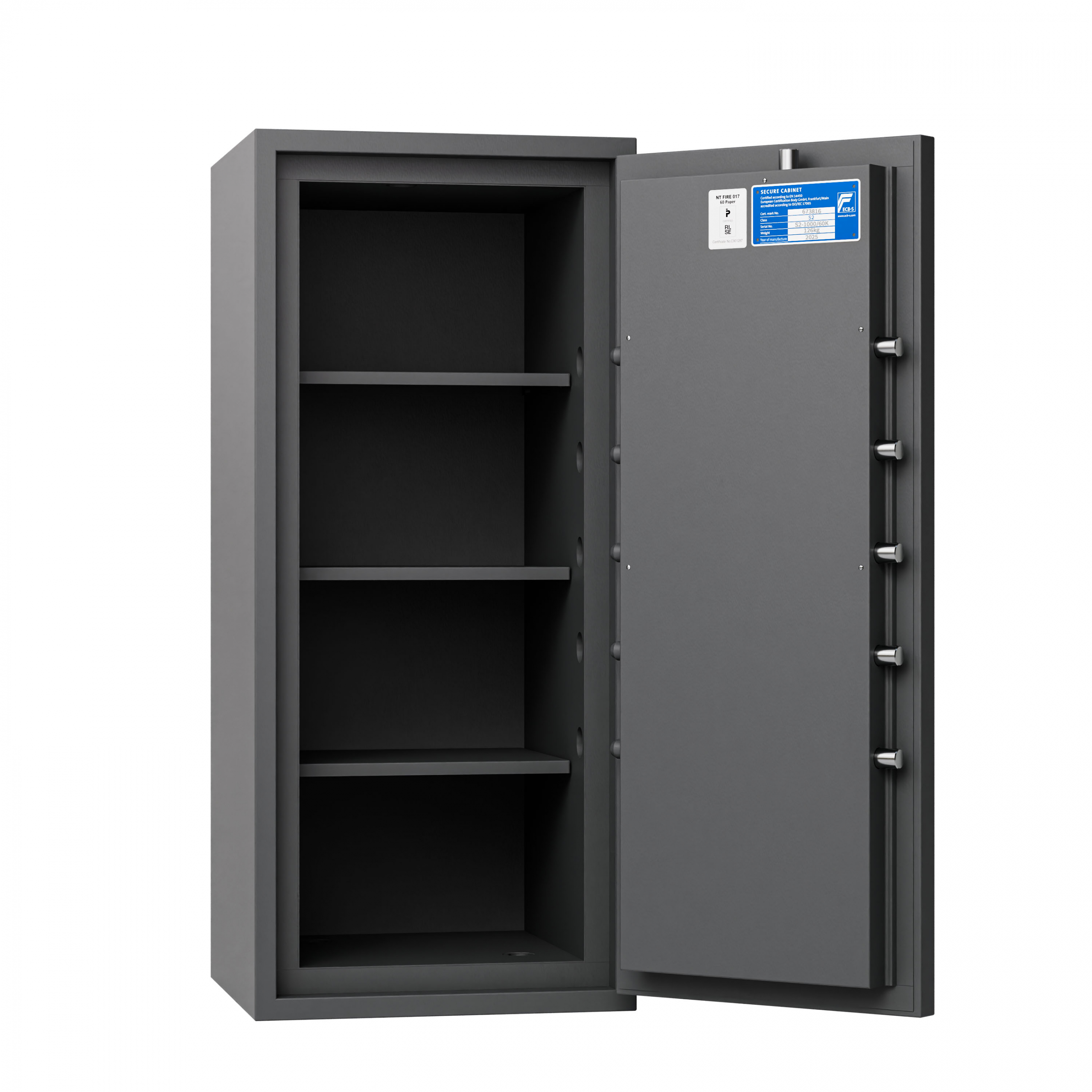 Stöldskyddsskåpet är testat och certifierat för stöld enligt EN 14450, klass S2 samt för brand enligt EN 15659 – LFS 60P (60 minuters brandskydd för papper).