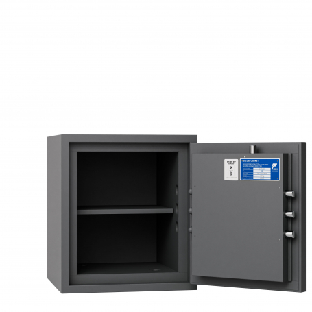 Stöldskyddsskåpet är testat och certifierat för stöld enligt EN 14450, klass S2 samt för brand enligt EN 15659 – LFS 60P (60 minuters brandskydd för papper).